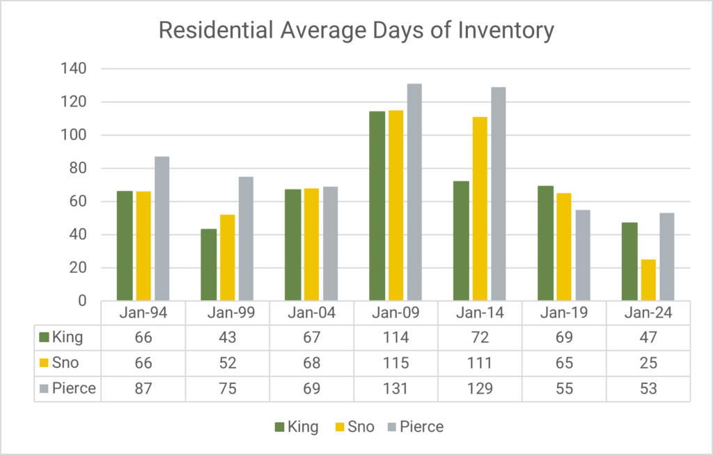 Another key metric that NWMLS tracks is the Average Days of Inventory. This metric represents the average number of days a property is on the market during a specific month. A balanced market is considered to be four to six months (120 – 180 days) by most industry experts. NWMLS data shows that over the last 30 years, King, Snohomish, Pierce counties have had less inventory than what is considered to be a balanced market, except for the period during the subprime mortgage crash of the late 2000s.