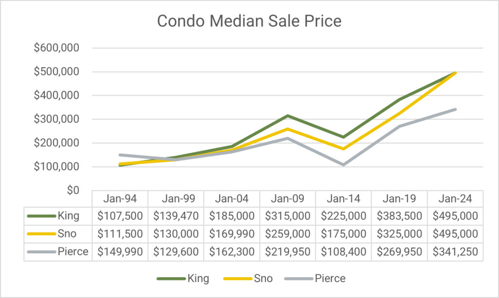 In order to provide a historic view, let’s take a look at how the Median Sale Price for residential homes and condominiums has changed over the last 30 years in King, Snohomish, and Pierce counties. NWMLS now provides detailed statistical data for 26 counties, but in order to look at sale price trends going back to the 90s, this article will focus on King, Snohomish, and Pierce counties only.