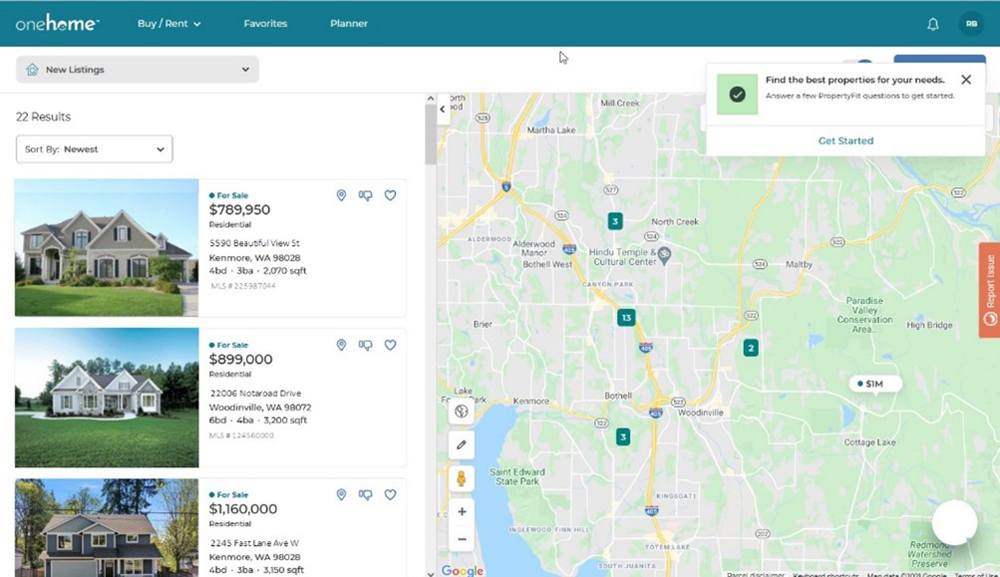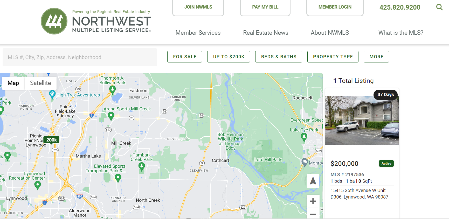 NWMLS launched NWRealEstate.com, one of the first public-facing websites for consumers to access MLS listings. When clicking on the map, a list of properties came up that showed all of the public-facing listing information, including one photo of the home.