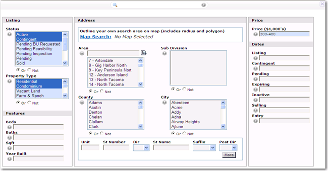 To search for a three plus bedroom, 1.75 plus bathroom home in North Kirkland with a listing price of $100,000 – $300,000, brokers would need to key in the following: