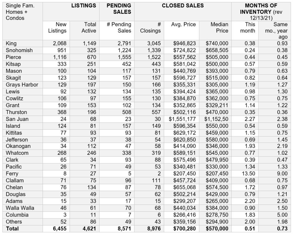 KIRKLAND, Washington (December 6, 2021) – Historically soggy weather and the onset of holidays did not deter thousands of buyers and sellers during November, based on the latest report from Northwest Multiple Listing Service. Numbers for new listings, pending sales, and closed sales were comparable to year-ago totals, while prices rose a little more than 15%.
