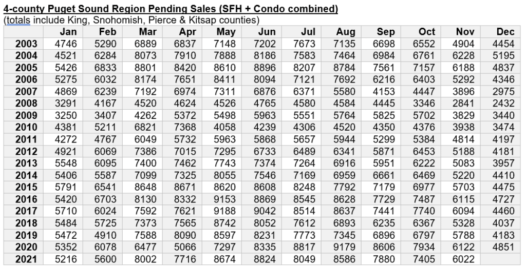 Area-wide, there were 4,621 active listings of single family homes and condominiums at month end, down nearly 29% from a year ago when there were 6,505 listings. The selection at month end amounted to about two weeks of supply (0.51 months). Five counties had even less supply: Snohomish (0.24 months), Thurston (0.35) King (0.38 months), Clark (0.39) and Pierce (0.44 months).