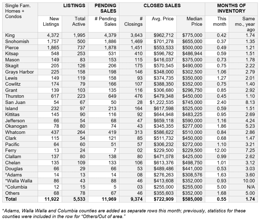 Months of inventory of homes and condominiums fell to just over two weeks (0.59 months) system-wide, which encompasses 26 of Washington’s 39 counties. Only March 2021 and December 2020 have been lower when both months ended with only 0.53 months of supply.