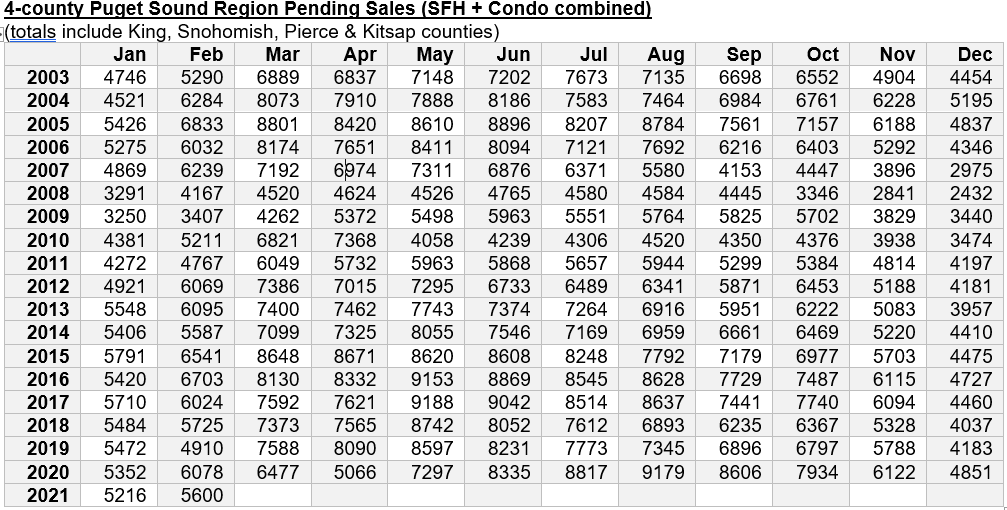 Area-wide, NWMLS figures show there is only about two weeks of inventory (0.53 months of supply) of single family homes and condominiums. Only six counties have more than one month of supply. The supply of single family homes is even more depleted (0.47 months), Condo buyers fare slightly better with 0.86 months of supply. With demand outstripping supply, prices tend to rise.
