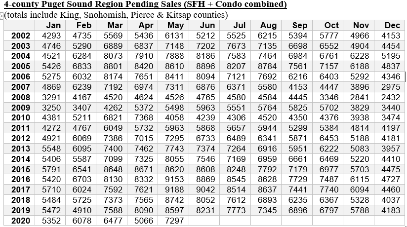 The NWMLS report shows 10,389 pending sales during May, improving on April’s total of 7,207 (up 44%), but down about 13.5% from the year-ago total of 12,006.