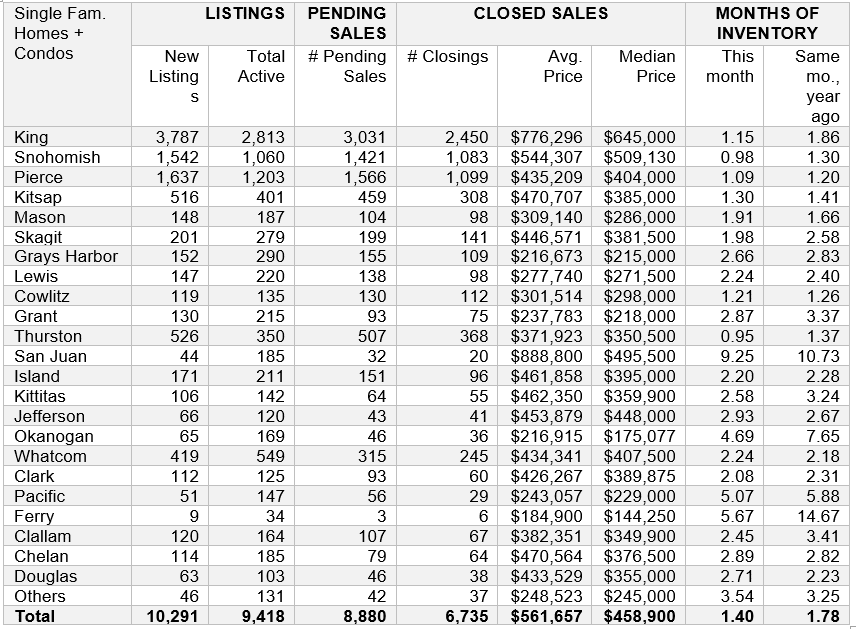 Median prices on last month’s completed transactions rose 10.3% from a year ago, increasing from $415,950 to $458,900. Only two counties (San Juan and Ferry) reported year-over-year price drops.