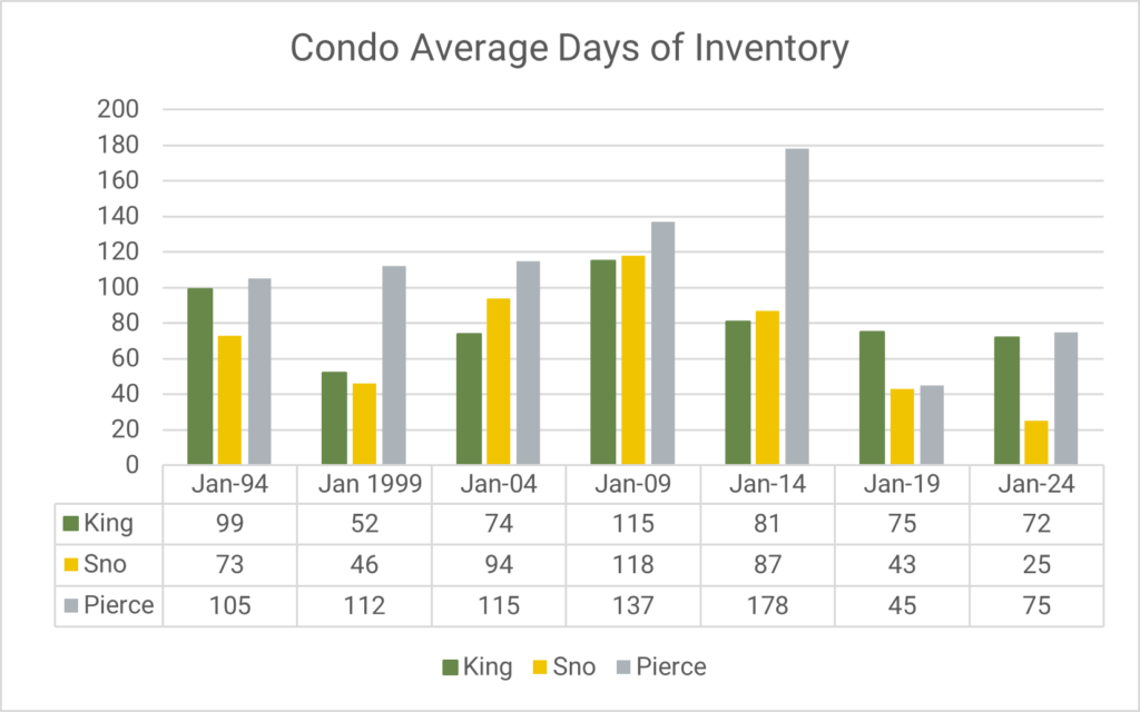 Another key metric that NWMLS tracks is the Average Days of Inventory. This metric represents the average number of days a property is on the market during a specific month. A balanced market is considered to be four to six months (120 – 180 days) by most industry experts. NWMLS data shows that over the last 30 years, King, Snohomish, Pierce counties have had less inventory than what is considered to be a balanced market, except for the period during the subprime mortgage crash of the late 2000s.