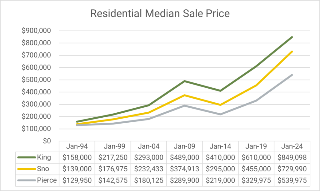 In January 1994, the Median Sale Price for a residential home was $158,000 in King County, $139,000 in Snohomish, and $129,950 in Pierce!