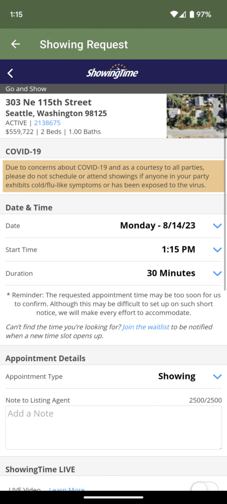 The real estate broker version of the Northwest MLS Mobile App allows NWMLS brokers to easily request showing appointments for properties while on the go! The NWMLS showing appointment platform also provides an app for sellers – ask your NWMLS broker for details!
