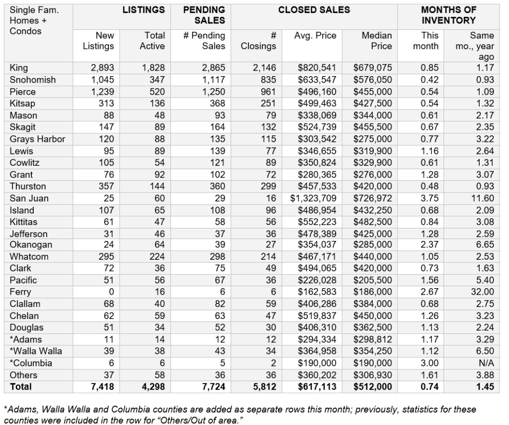 Area-wide, NWMLS figures show there is only about two weeks of inventory (0.53 months of supply) of single family homes and condominiums. Only six counties have more than one month of supply. The supply of single family homes is even more depleted (0.47 months), Condo buyers fare slightly better with 0.86 months of supply. With demand outstripping supply, prices tend to rise.