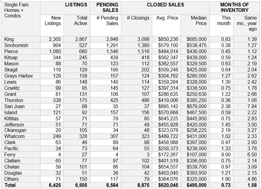 Kitsap County is among the areas experiencing double-digit activity in pending sales, closed sales, and prices. “Competition in the fast-moving market is fierce with buyers now using non-refundable earnest money and waiving inspections and financing. This is unprecedented compared to past markets,” stated Frank Leach, broker/owner at RE/MAX Platinum Services.