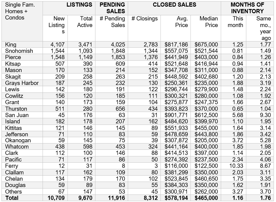 “Extraordinarily low month’s supply indicates that prices may have more room to move in areas popular with people trading down or seeking more space but still close to Seattle,” suggested Young. “Mason County and Thurston County come to mind, but interestingly, several Central Washington counties had strong year-over-year price growth including Kittitas (30%), Chelan (22%) and Grant (9.4%).”
