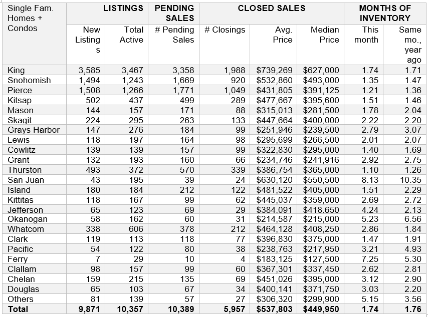 The median price on last month’s closed sales was $449,950 across the NWMLS coverage area. That compares to the year-ago figure of $440,000 an increase of about 2.3%.