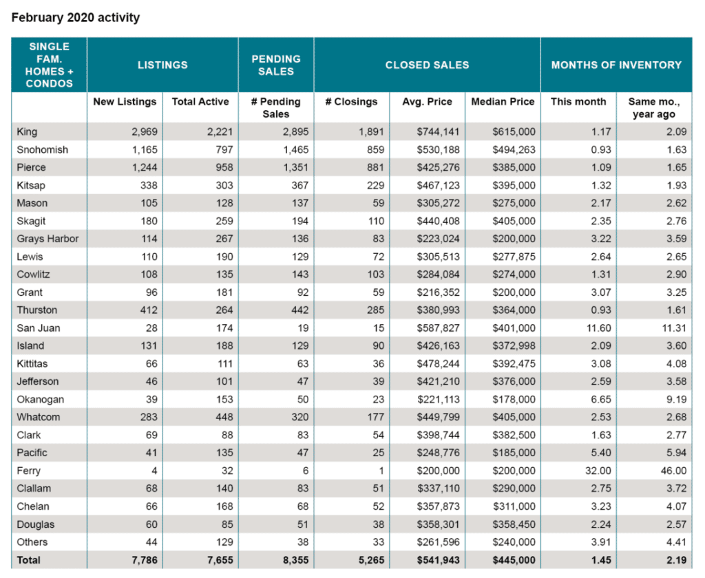 “While the news is full of COVID-19, the stock market correction, and an unexpected interest rate cut that didn’t impress Wall Street, the Puget Sound region’s real estate market continues to stand strong,” stated Mike Grady, president and COO at Coldwell Banker Bain in Bellevue. “Our agents aren’t yet seeing any impact on open house attendance due to the COVID-19 outbreak. We continue to be bullish on the Puget Sound economy and real estate market.”