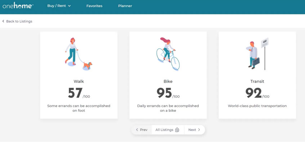 The platform also offers neighborhood information, such as school ratings, walk score, public records data, estimated monthly costs (mortgage, taxes, etc.), and market insights (median sale price, owner/renter occupied percentages, age and income demographics) for the local area.